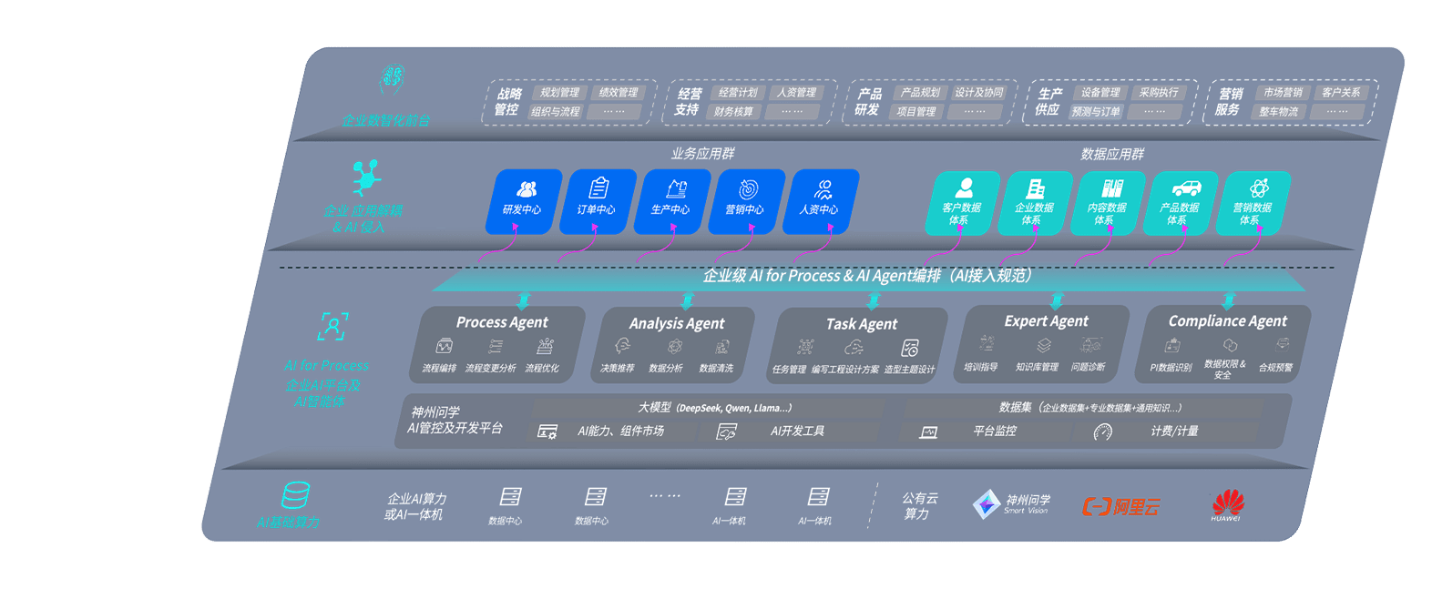端到端的一站式AI工作空间深度融合了从企业战略规划到日常经营的全流程业务板块,,定向解决车企内部领域多、、部门多、、、、链条长、、场景碎片化等难题,,支持车企快速构建以AI为核心的生产力写作体系,,,实现任务执行与AI能力的无缝集成与交互
